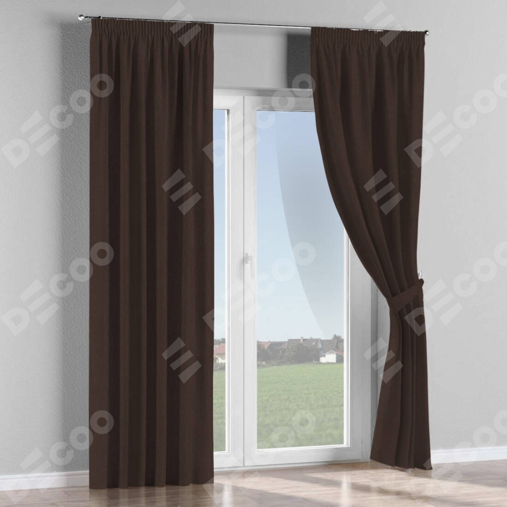 Комплект прямых штор, от производителя «Cortin», пошиты из ткани лён димаут венге, артикул ткани 91001. С изнаночной стороны в верхней части штор пристрачивается шторная лента с декоративными складками «Карандаш». Для создания элегантных складок прямые шторы шьются по стандарту с коэффициентом 1:2 (на 100 см. ширины проёма 200 см. ширины ткани).