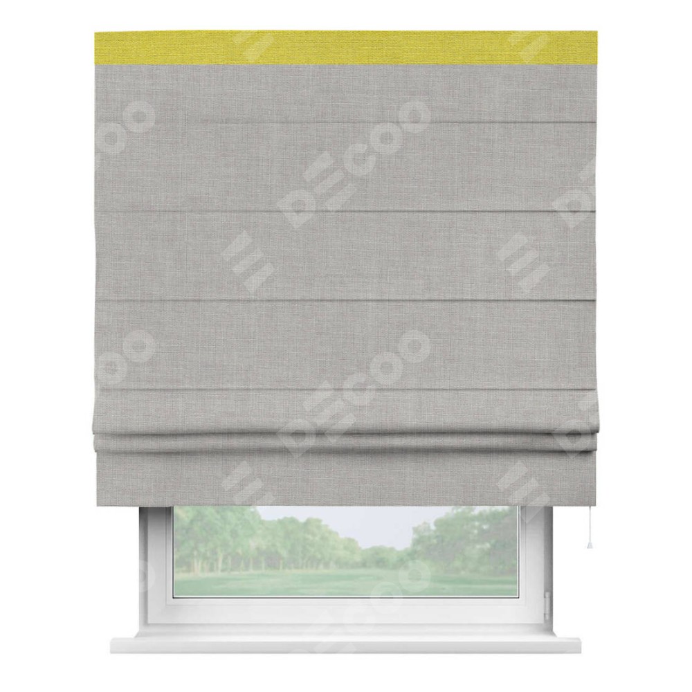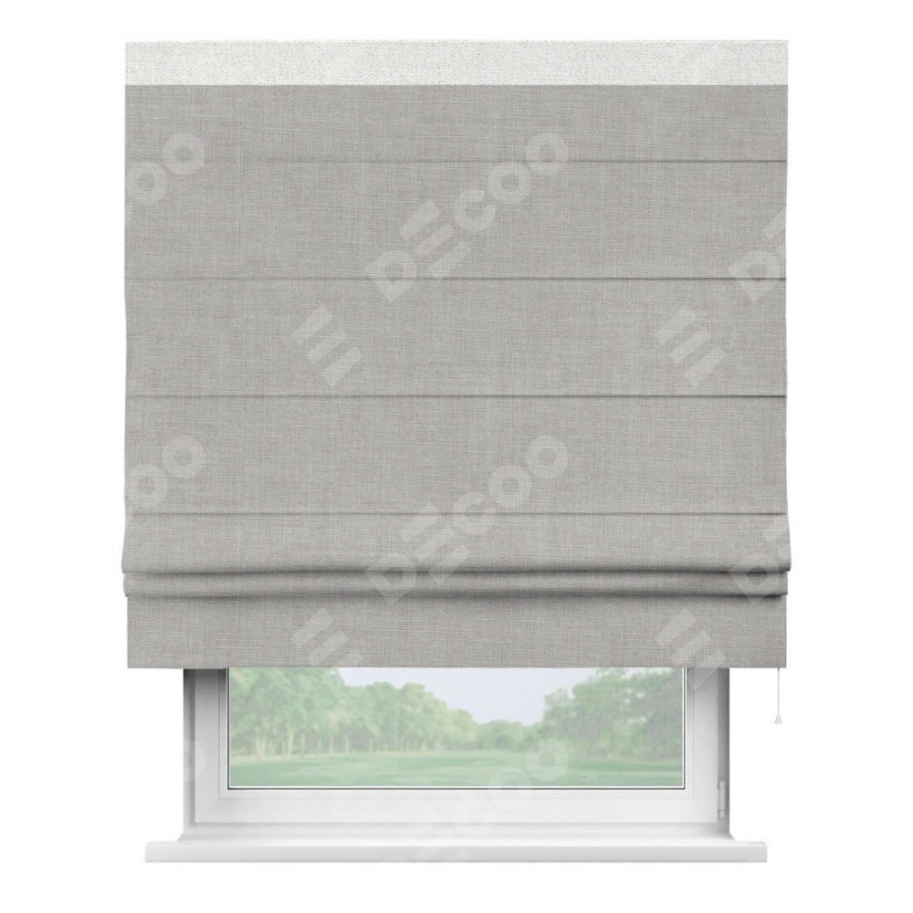 Римская штора пошита из ткани лён серый, артикул: 91410, с отделкой кантом «Кинг» отличается своей необычной особенностью: кант располагается исключительно сверху шторы. Такой дизайн делает акцент на верхней части окна, визуально поднимая потолок и придавая интерьеру более возвышенный и изысканный вид. Отделка кантом на верхней кромке не только украшает штору, но и может служить дополнительной защитой от износа в месте наибольшего контакта с механизмом управления шторой.