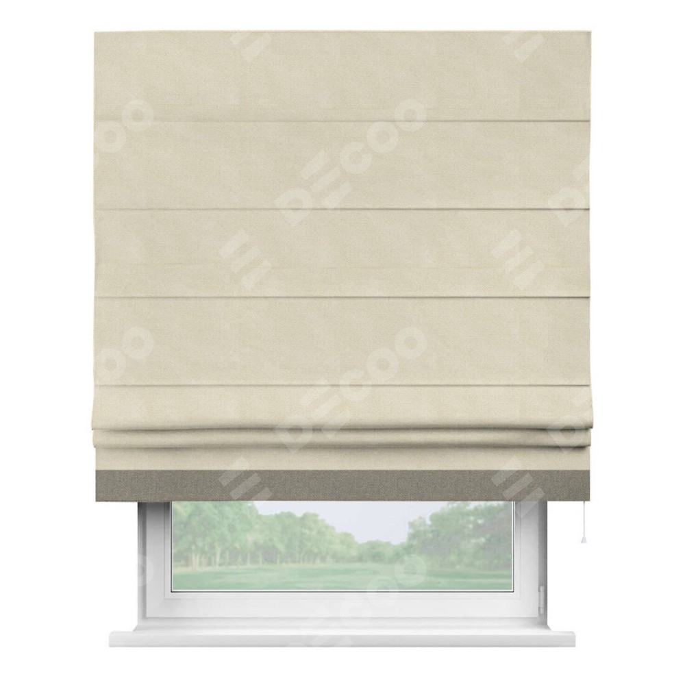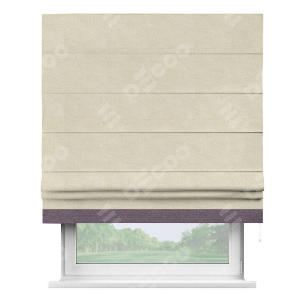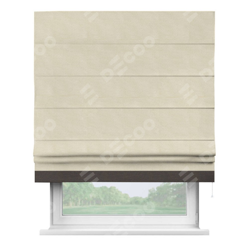 Римская штора производителя «Cortin», используется для проёма, пошита из ткани лён димаут бежевый, артикул 83023. Отделка шторы кантом «Джестер», ткань для канта используется из льна димаут разной расцветки на выбор. Имеет универсальный механизм и подходит для монтажа: на потолок, на стену и в нишу.