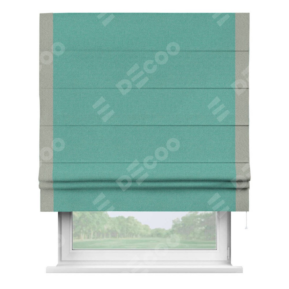Римская штора производителя «Cortin», используется для проёма, пошита из ткани лён димаут бирюзовый, артикул 23. Отделка шторы кантом «Стрим Дуо», ткань для канта используется из льна димаут разной расцветки на выбор. Имеет универсальный механизм и подходит для монтажа: на потолок, на стену и в нишу.