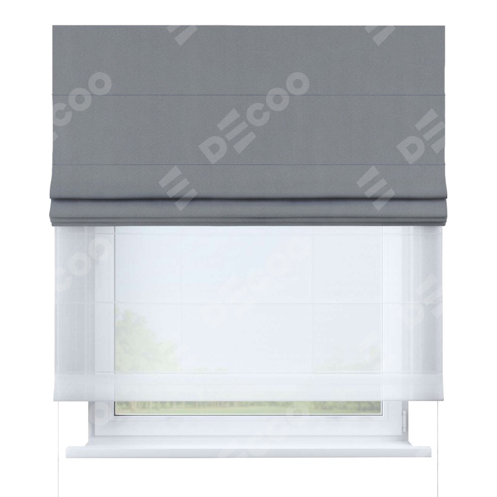 Двойная римская штора «День-ночь» от производителя Cortin предназначена для использования в проёмах. Эта штора уникальна тем, что состоит из двух полотен. На лицевой стороне находится однотонный блэкаут серый (артикул: 146436), обеспечивающий эффективное затемнение. В комплект также входит вторая ткань — легкий белый тюль (артикул: V-01), который добавляет изящества и легкости оформлению окна. Кроме того, доступны и другие разновидности ткани тюль, выбор которых доступен по ссылке .
