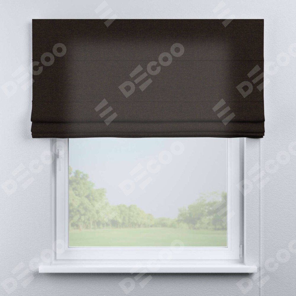 Классическая римская штора производителя «Cortin», пошита из ткани лён тёмно-коричневый, артикул: 104497. Имеет универсальный механизм и подходит для монтажа: на потолок, на стену и в нишу.