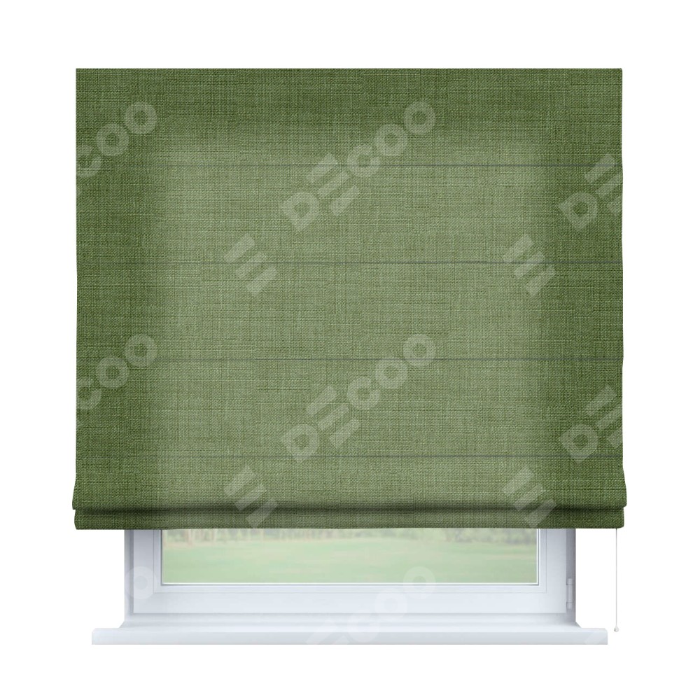Классическая римская штора производителя «Cortin», пошита из ткани лён зелёный, артикул: 131547. Имеет универсальный механизм и подходит для монтажа: на потолок, на стену и в нишу.