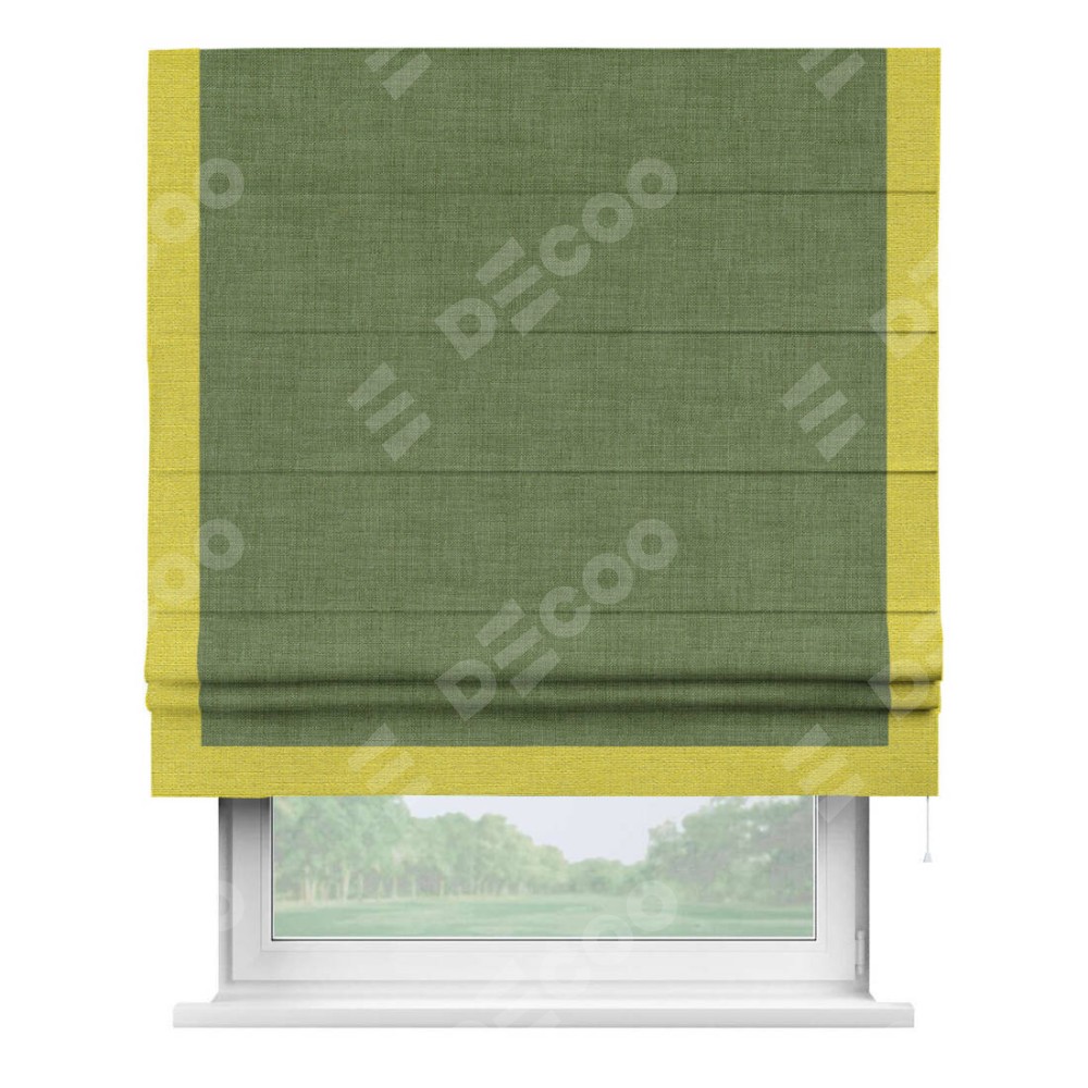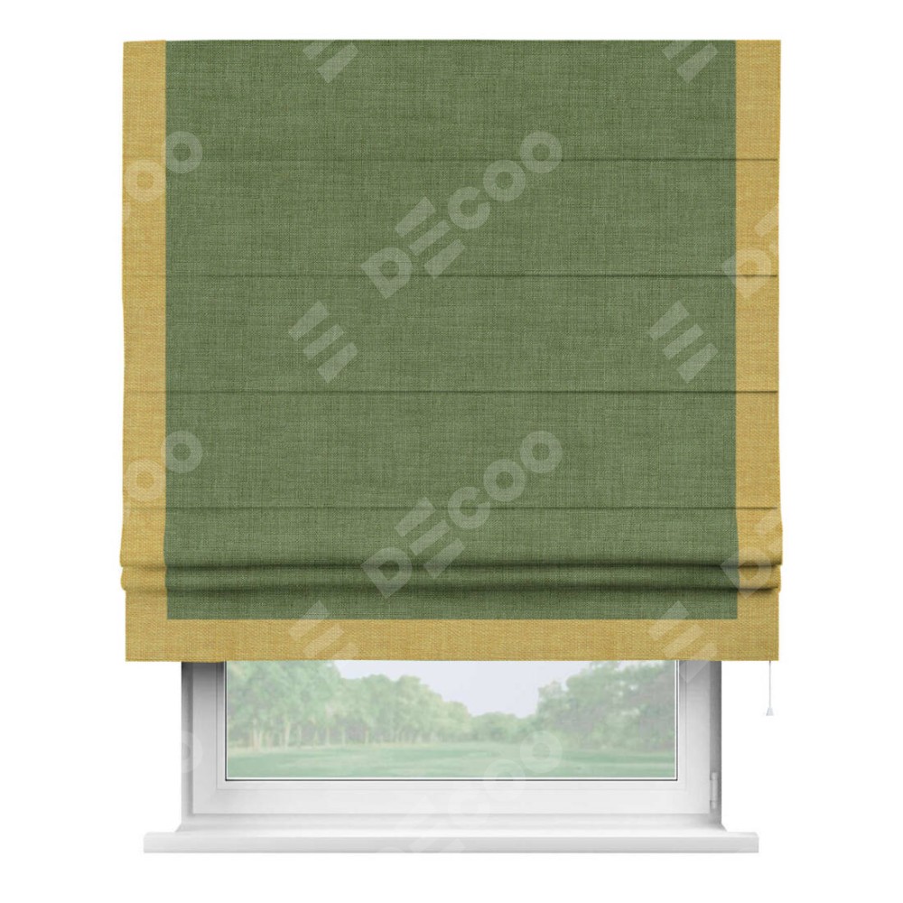 Классическая римская штора производителя «Cortin», пошита из ткани лён зелёный, артикул: 131547. Имеет универсальный механизм и подходит для монтажа: на потолок, на стену и в нишу.