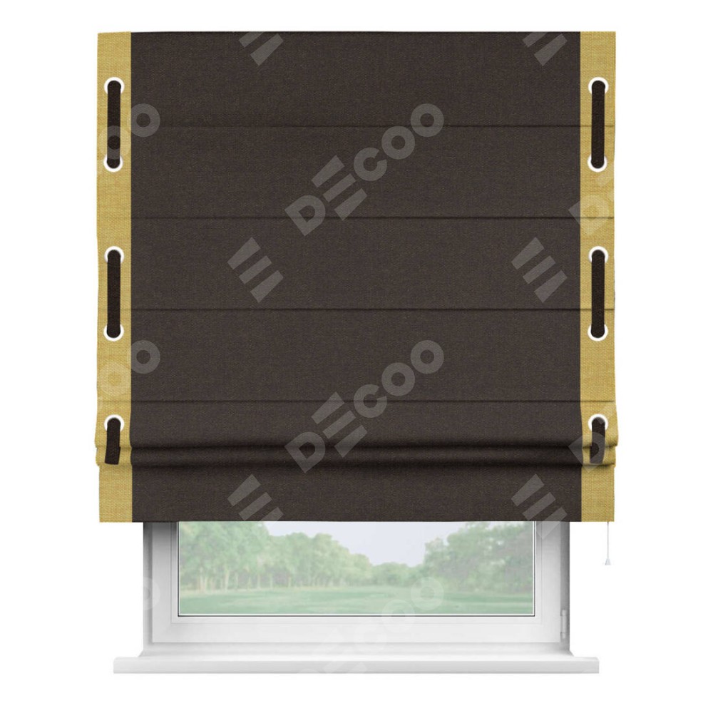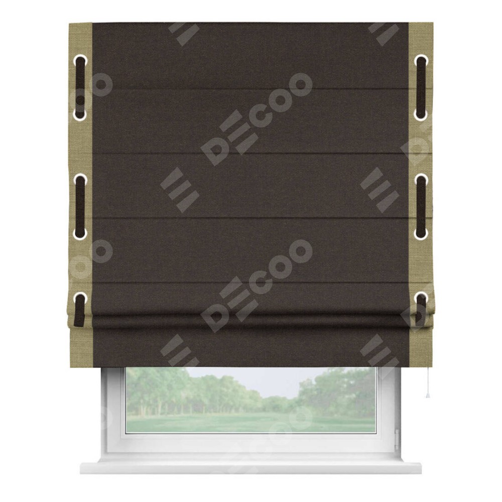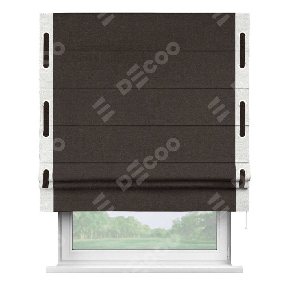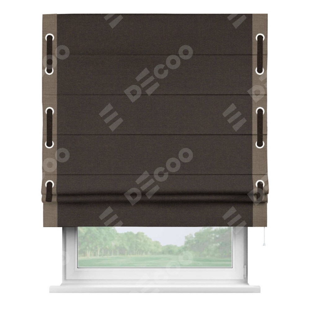 Классическая римская штора производителя «Cortin», пошита из ткани лён тёмно-коричневый, артикул: 104497. Имеет универсальный механизм и подходит для монтажа: на потолок, на стену и в нишу.