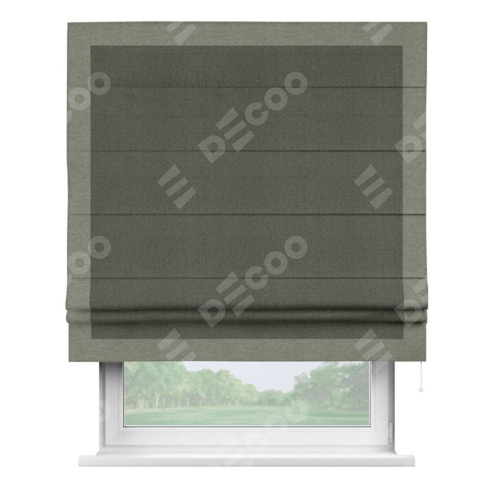 Римская штора производителя «Cortin», используется для проёма, пошита из ткани лён димаут графит, артикул 27. Отделка шторы кантом «Чесс», ткань для канта используется из льна димаут разной расцветки на выбор. Имеет универсальный механизм и подходит для монтажа: на потолок, на стену и в нишу.