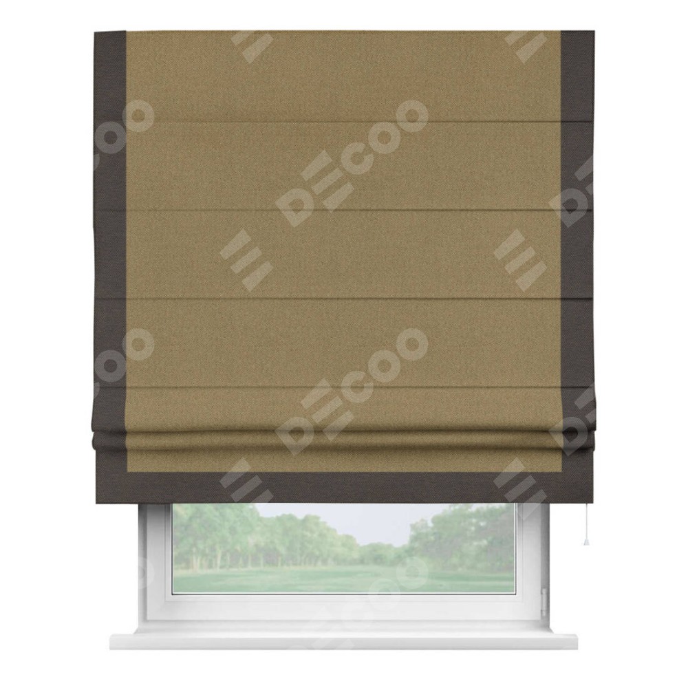Римская штора производителя «Cortin», используется для проёма, пошита из ткани лён димаут оливковый, артикул 16243. Отделка шторы кантом «Виктория», ткань для канта используется из льна димаут разной расцветки на выбор. Имеет универсальный механизм и подходит для монтажа: на потолок, на стену и в нишу.