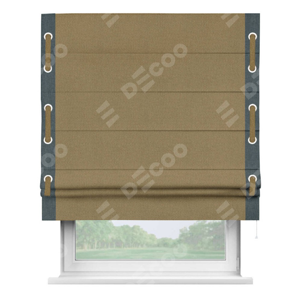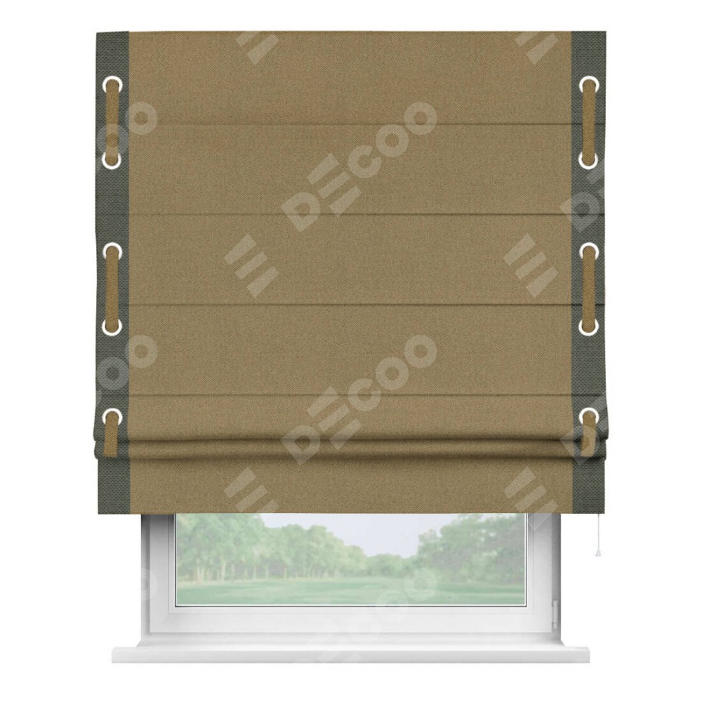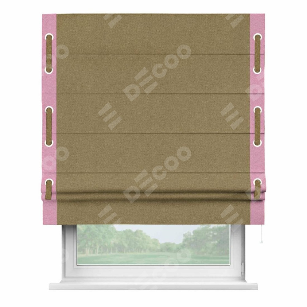 Римская штора производителя «Cortin», используется для проёма, пошита из ткани лён димаут оливковый, артикул 16243. Отделка шторы кантом «Стрим Дуо» на кантах расположены люверсы с пояском, ткань для канта используется лён димаут разной расцветки на выбор. Ткань для пояска обычно используется из основной ткани шторы, а так же можно сделать из любой расцветки по желанию. Имеет универсальный механизм и подходит для монтажа: на потолок, на стену и в нишу.