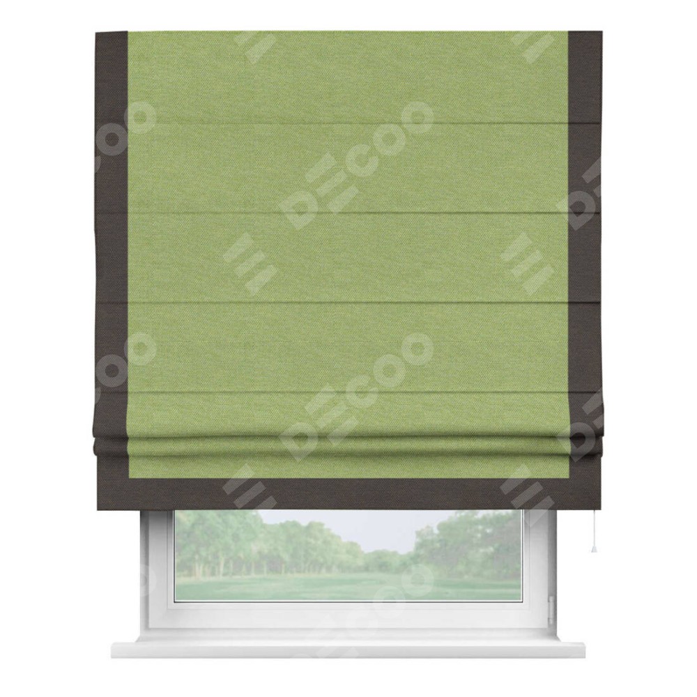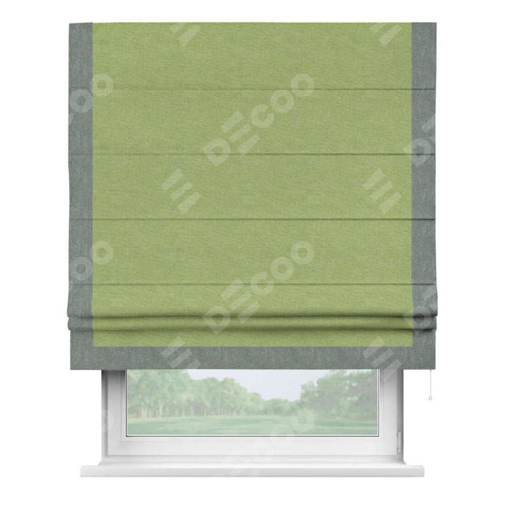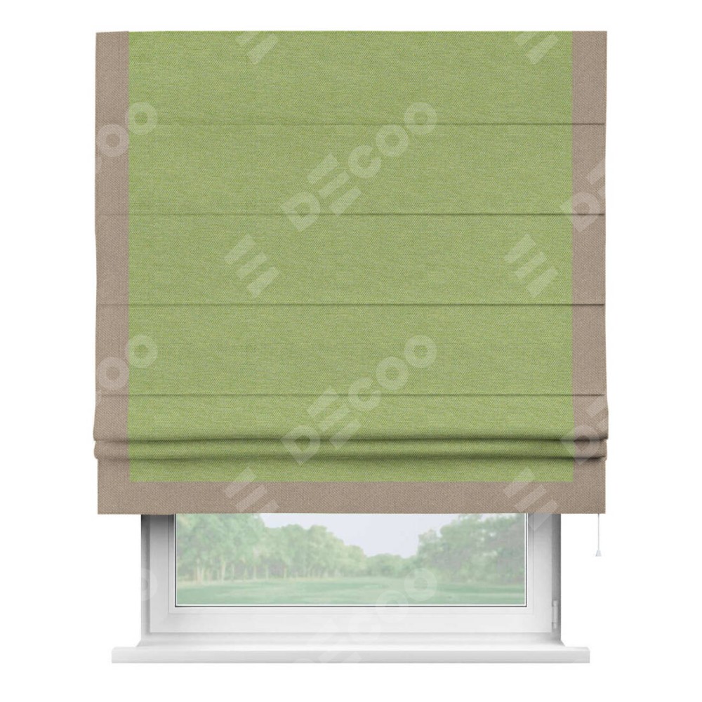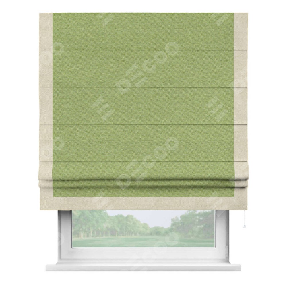 Римская штора производителя «Cortin», используется для проёма, пошита из ткани лён димаут салатовый, артикул 83032. Отделка шторы кантом «Виктория», ткань для канта используется из льна димаут разной расцветки на выбор. Имеет универсальный механизм и подходит для монтажа: на потолок, на стену и в нишу.
