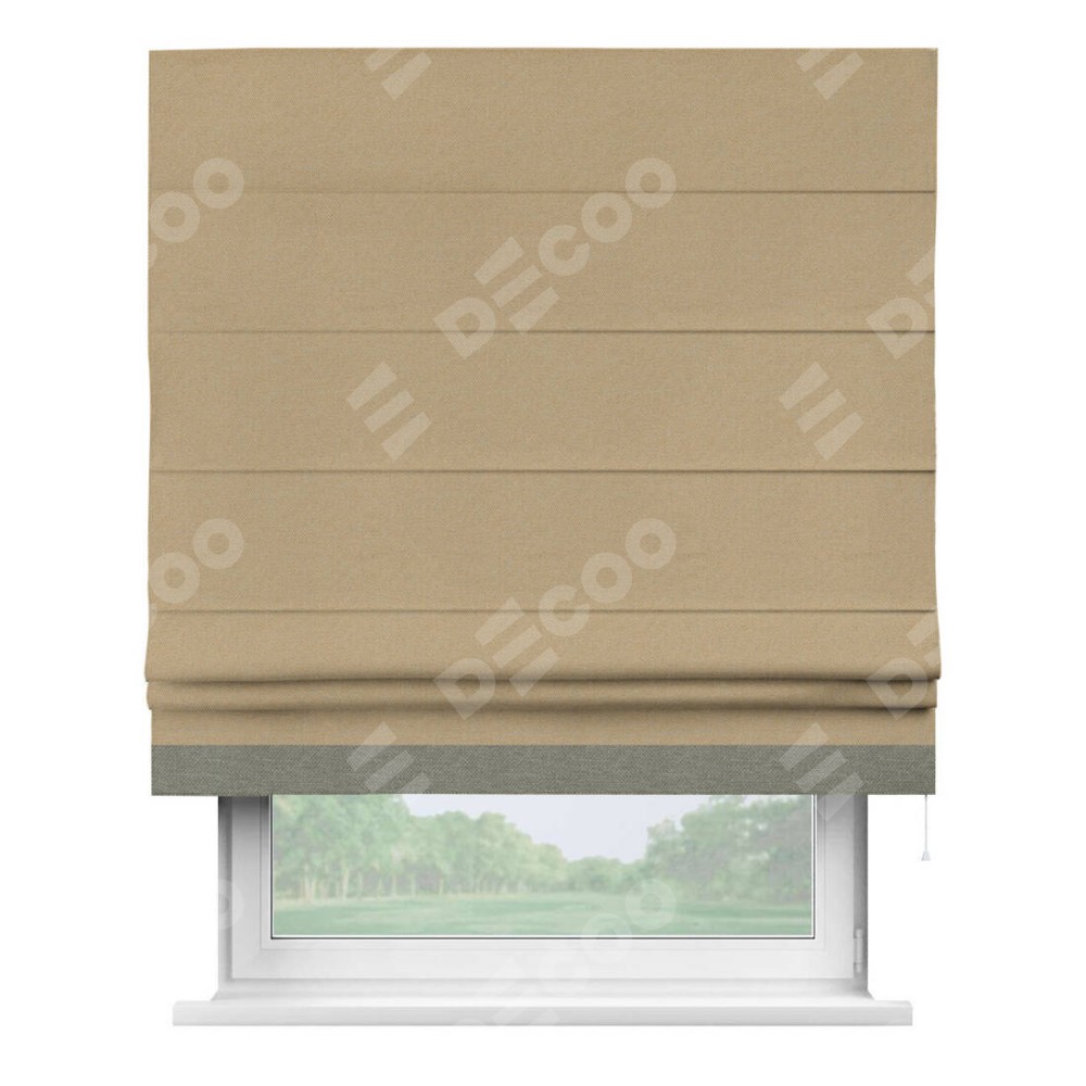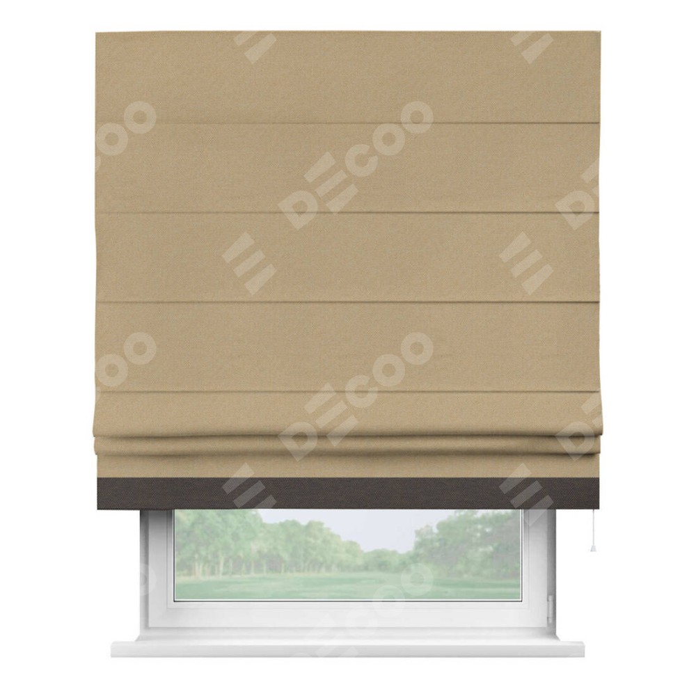 Римская штора производителя «Cortin», используется для проёма, пошита из ткани лён димаут тёмно-бежевый, артикул 83037. Отделка шторы кантом «Джестер», ткань для канта используется из льна димаут разной расцветки на выбор. Имеет универсальный механизм и подходит для монтажа: на потолок, на стену и в нишу.