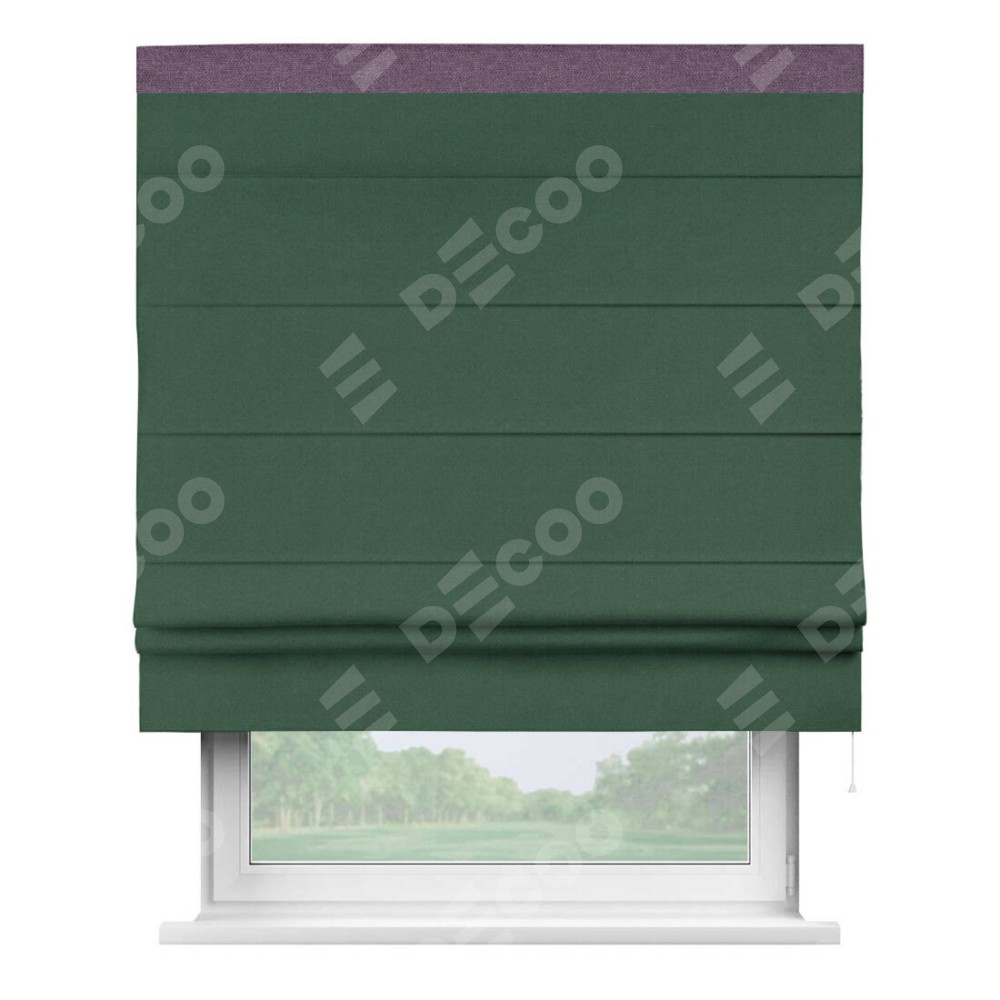 Римская штора производителя «Cortin», используется для проёма, пошита из ткани лён димаут тёмно-зелёный, артикул 16246. Отделка шторы кантом «Кинг», ткань для канта используется из льна димаут разной расцветки на выбор. Имеет универсальный механизм и подходит для монтажа: на потолок, на стену и в нишу.