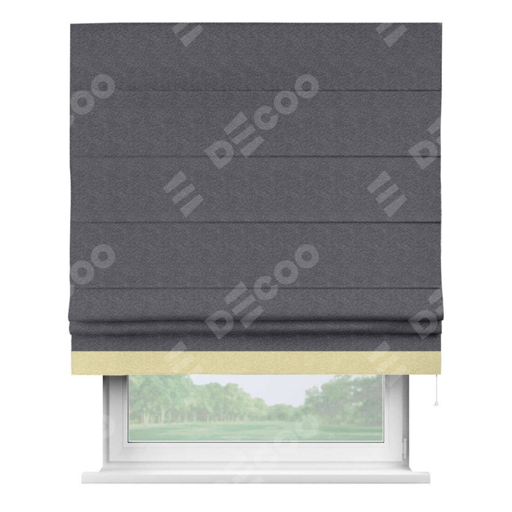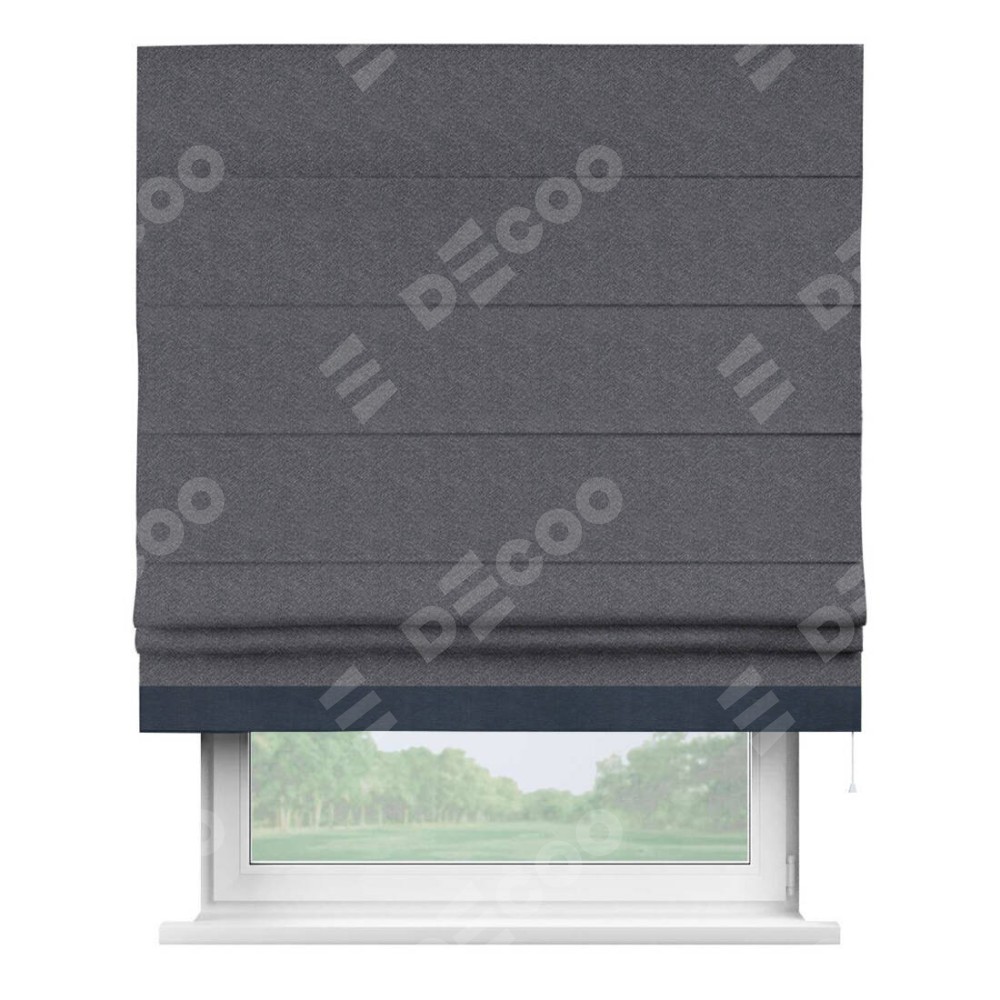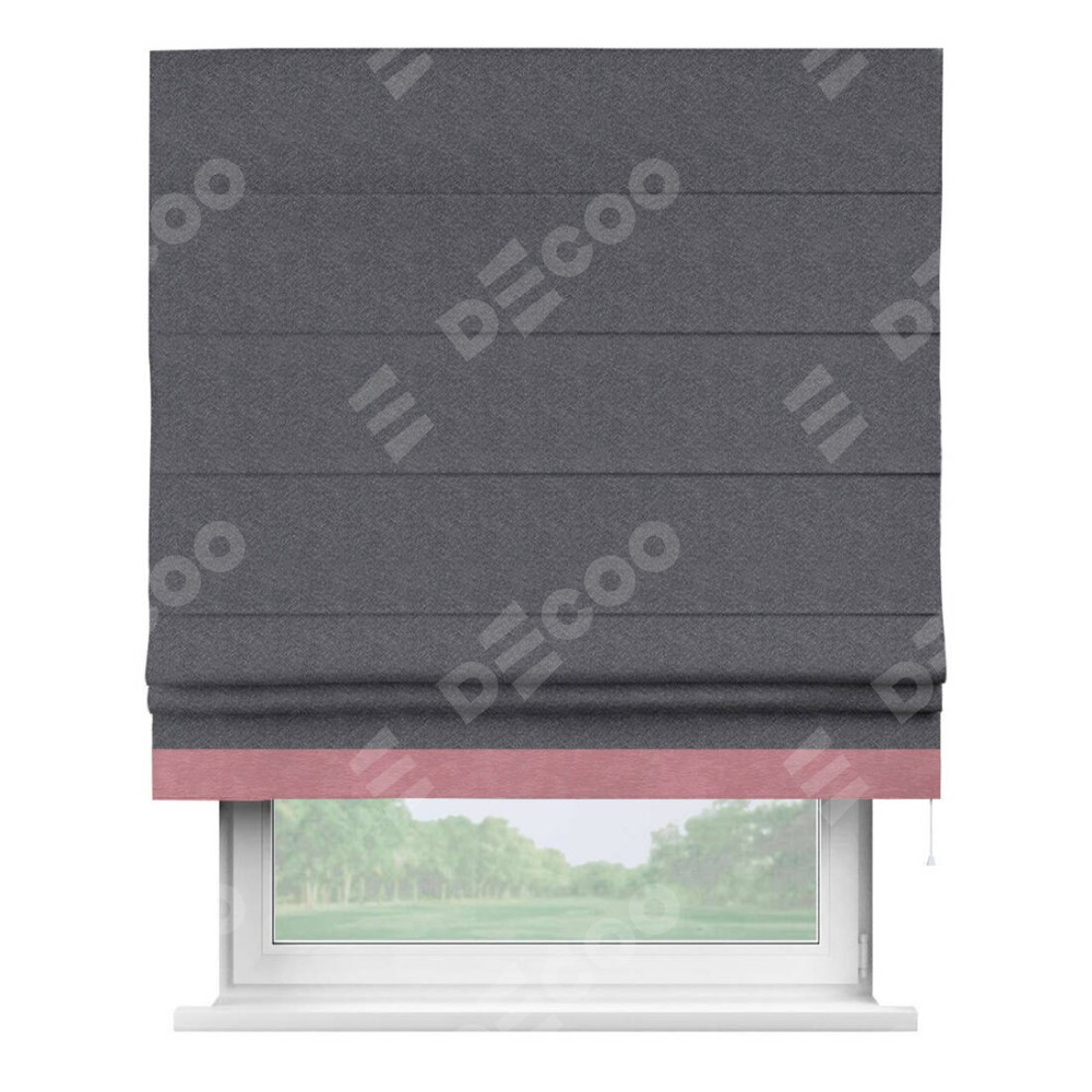Римская штора производителя «Cortin», используется для проёма, пошита из ткани софт однотонный графит, артикул 19316. Отделка шторы кантом «Джестер», ткань для канта используется из софта разной расцветки на выбор. Имеет универсальный механизм и подходит для монтажа: на потолок, на стену и в нишу.
