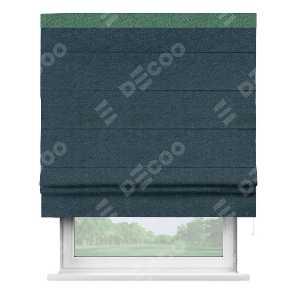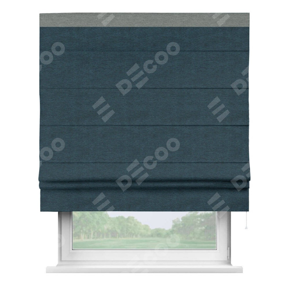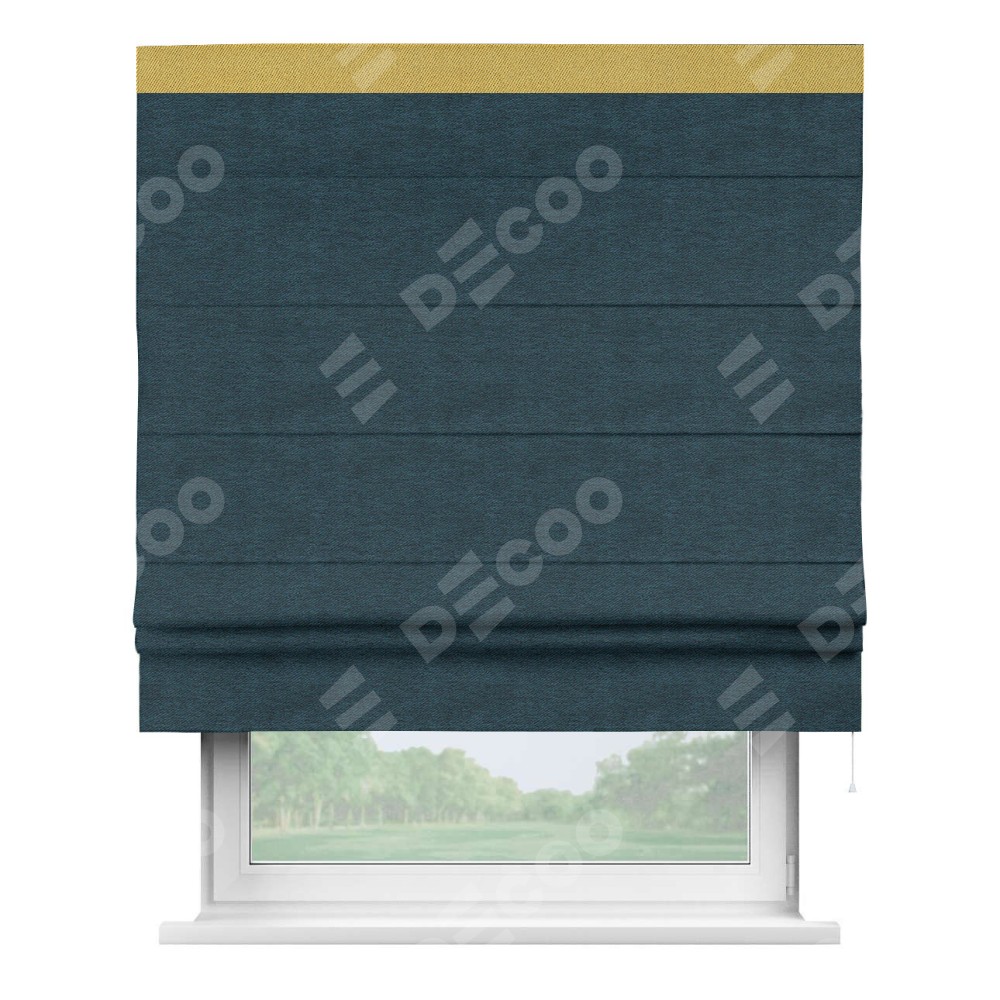 Римская штора производителя «Cortin», используется для проёма, пошита из ткани твид блэкаут глубокий синий, артикул 21590. Отделка шторы кантом «Кинг», ткань для канта используется из твида разной расцветки на выбор. Имеет универсальный механизм и подходит для монтажа: на потолок, на стену и в нишу.