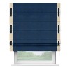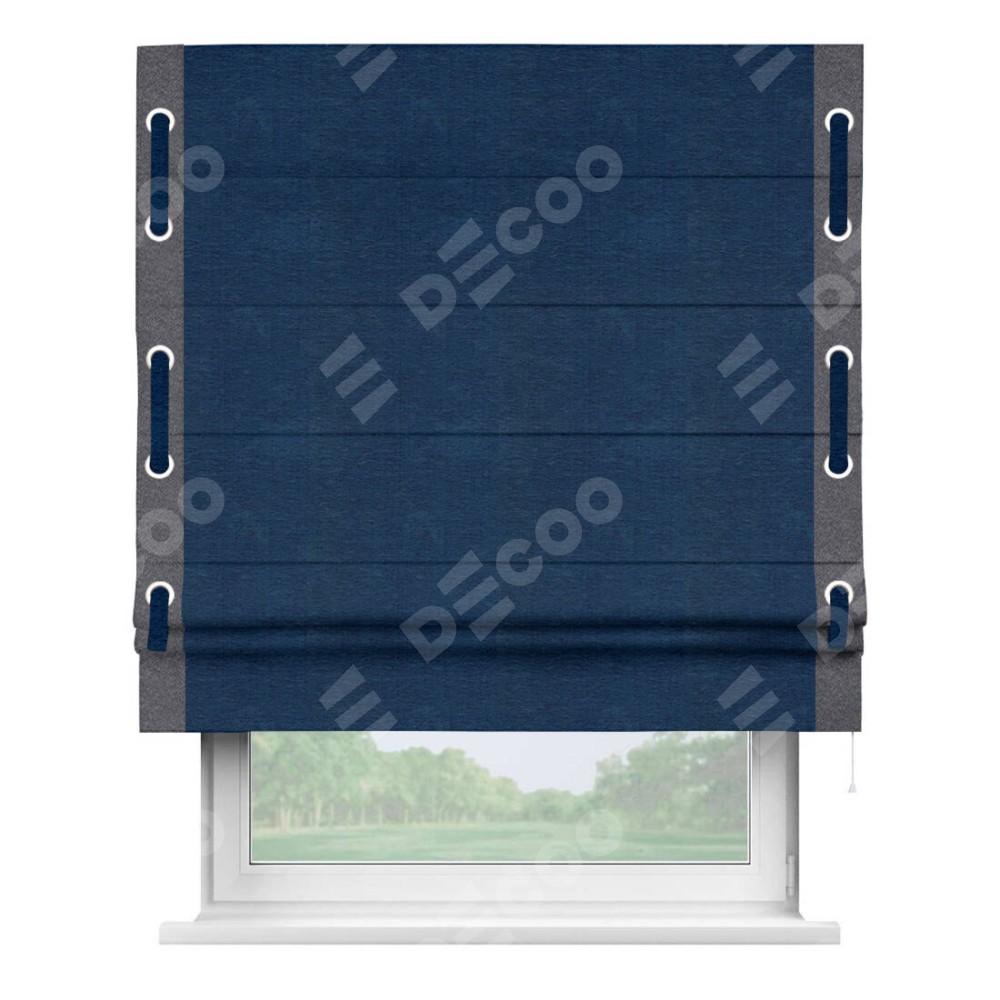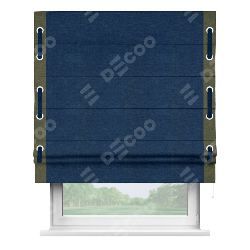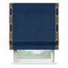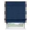 Римская штора производителя «Cortin», используется для проёма, пошита из ткани софт однотонный синий, артикул 42937. Отделка шторы кантом «Стрим Дуо» на кантах расположены люверсы с пояском, ткань для канта используется из софта разной расцветки на выбор. Ткань для пояска обычно используется из основной ткани шторы, а так же можно сделать из любой расцветки по желанию. Имеет универсальный механизм и подходит для монтажа: на потолок, на стену и в нишу.