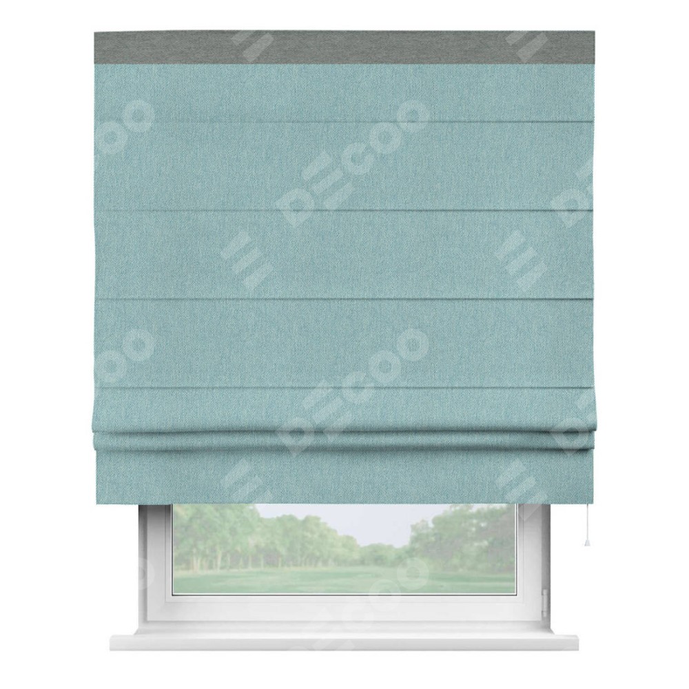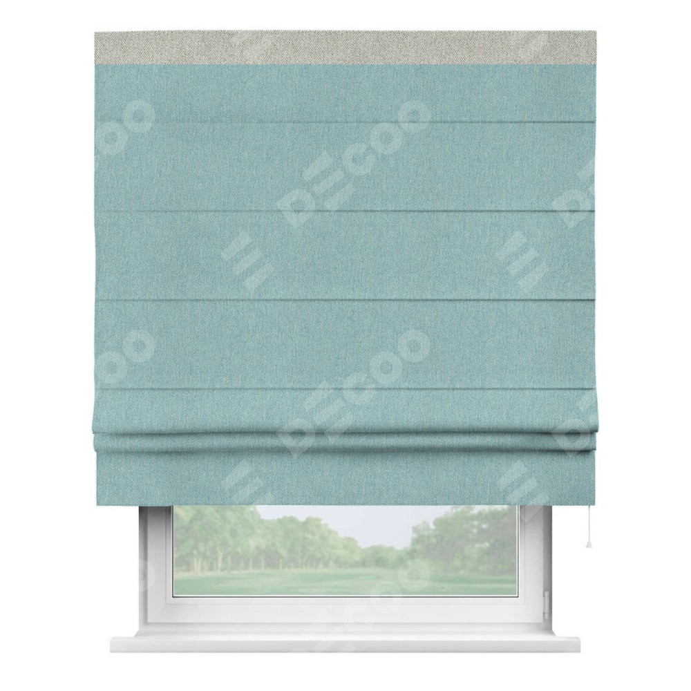 Римская штора производителя «Cortin», используется для проёма, пошита из ткани твид блэкаут небесно-голубой, артикул 21578. Отделка шторы кантом «Кинг», ткань для канта используется из твида разной расцветки на выбор. Имеет универсальный механизм и подходит для монтажа: на потолок, на стену и в нишу.