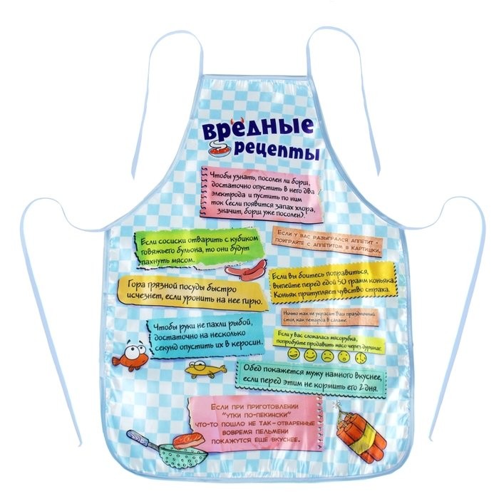 Чтобы на вашей кухне всегда царило позитивное настроение во время готовки, непременно наденьте фартук полноцветный «Вредные рецепты». Его эксклюзивный принт сделает приготовление блюд нескучным, а средняя длина защитит вашу одежду от пятен. Благодаря выбранному материалу фартук дополнит ваш образ изысканностью и стилем!