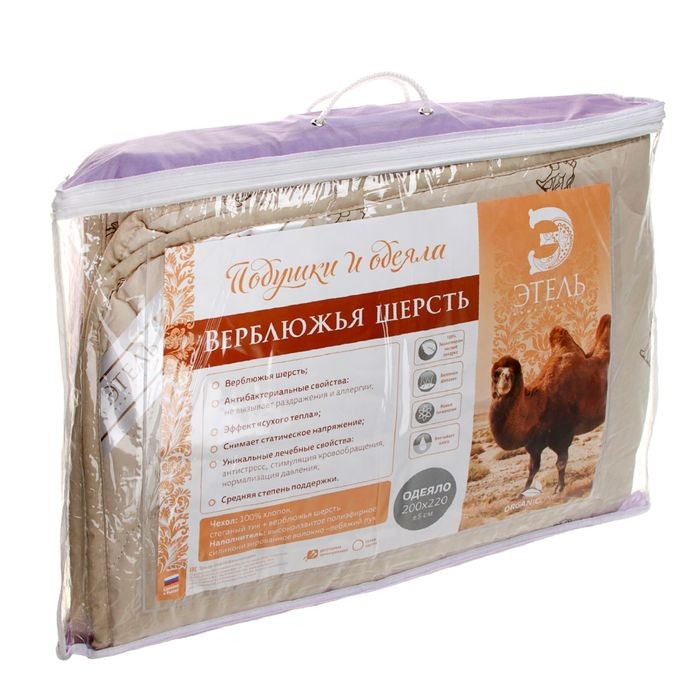 Утеплитель: верблюжья шерсть 50%, лебяжий пух (высокоизвитое полиэфирное силиконизированное волокно) 50%, плотность наполнителя 300 г/м².