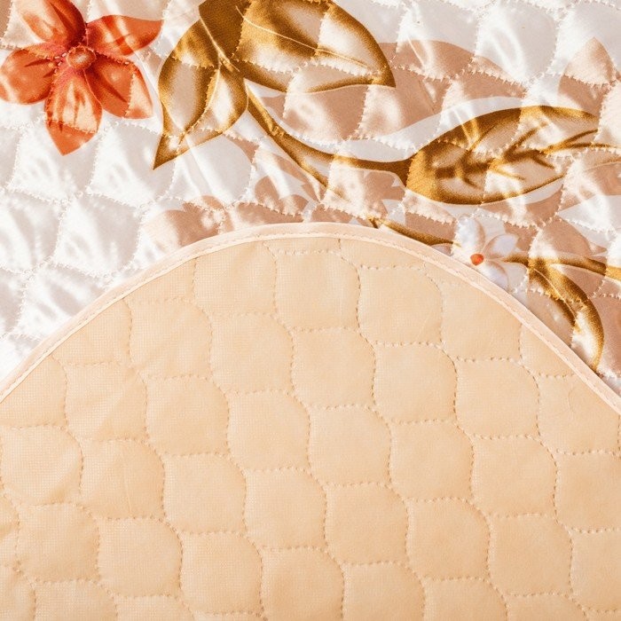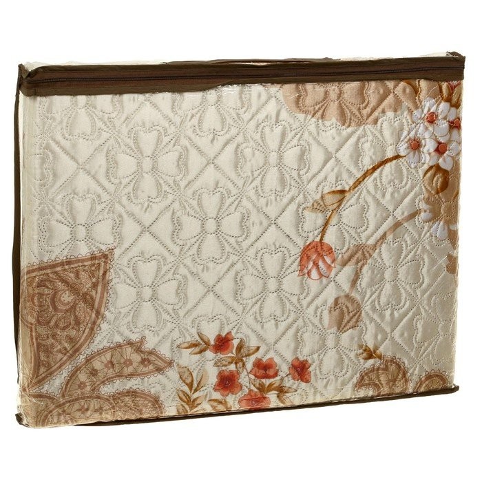 Характеристики: Ткань искусственный шелк, плотность 107 гр/м2, активное (стойкое) крашение. Верх покрывала — набивной рисунок в виде панно, низ — однотонная ткань. Края обработаны шелковой бейкой, упаковка прозрачный чемодан ПВХ с большим вкладышем.