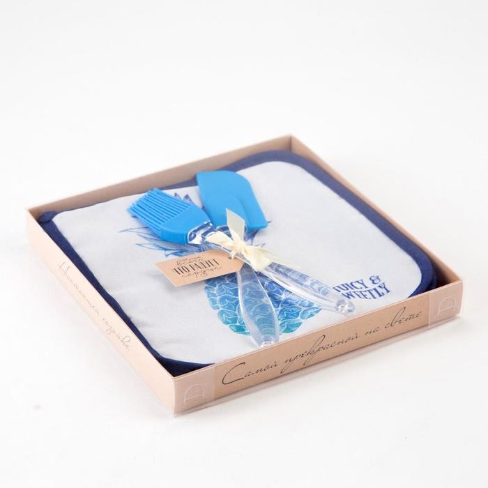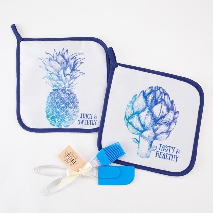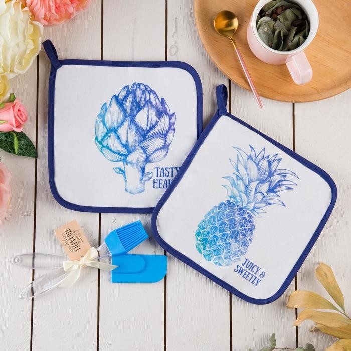 В набор входит 2 прихватки 19 × 19 см, силиконовые лопатка и кисточка.